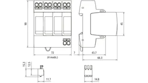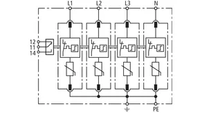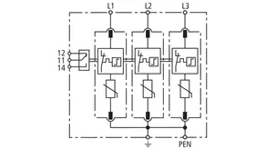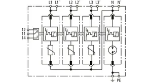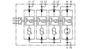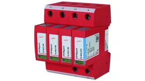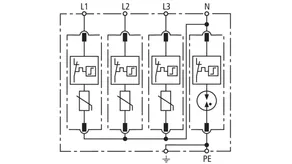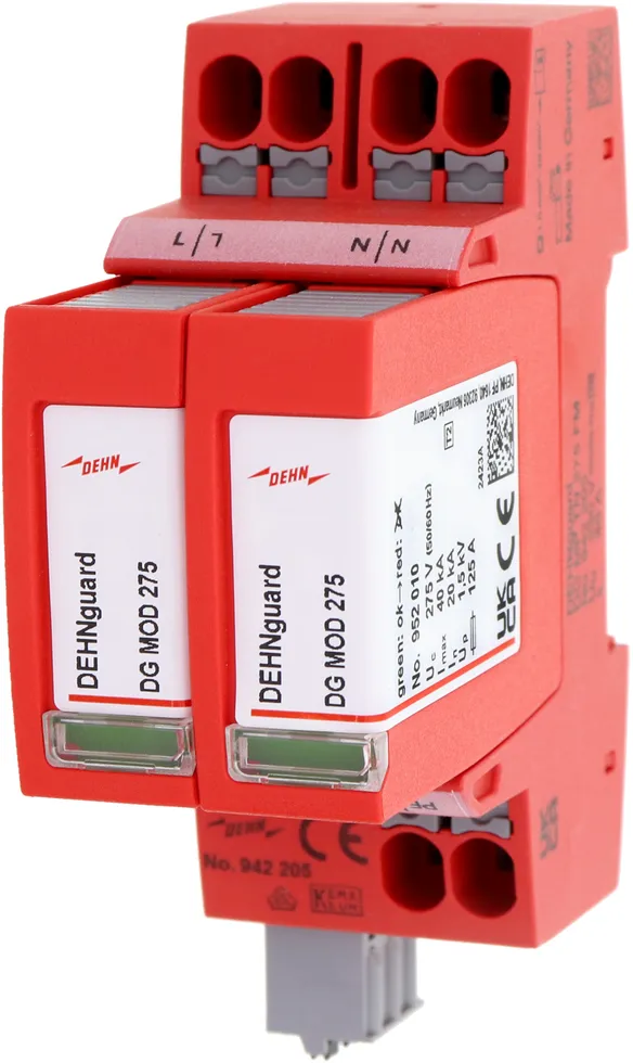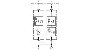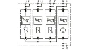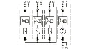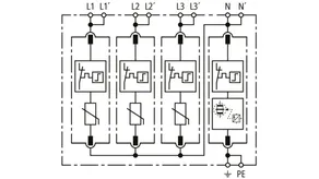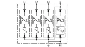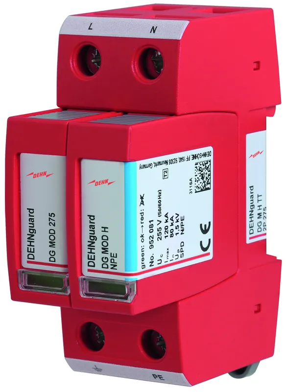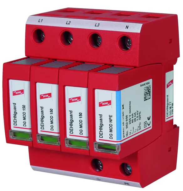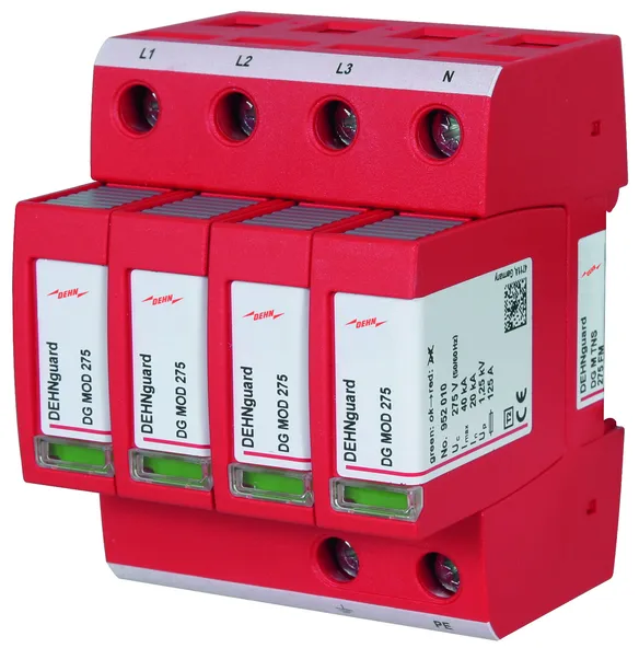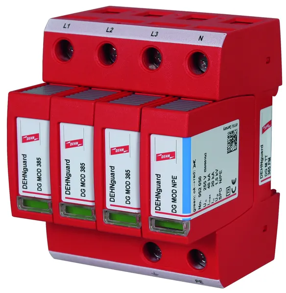 Modular surge arrester with a high total discharge capacity in the N-PE path for TT and TN-S systems (3+1 configuration). Meets the stricter safety requirements as outlined in DIN VDE 0100-534 for use at the feeding point of the electrical installation; with floating remote signalling contact.