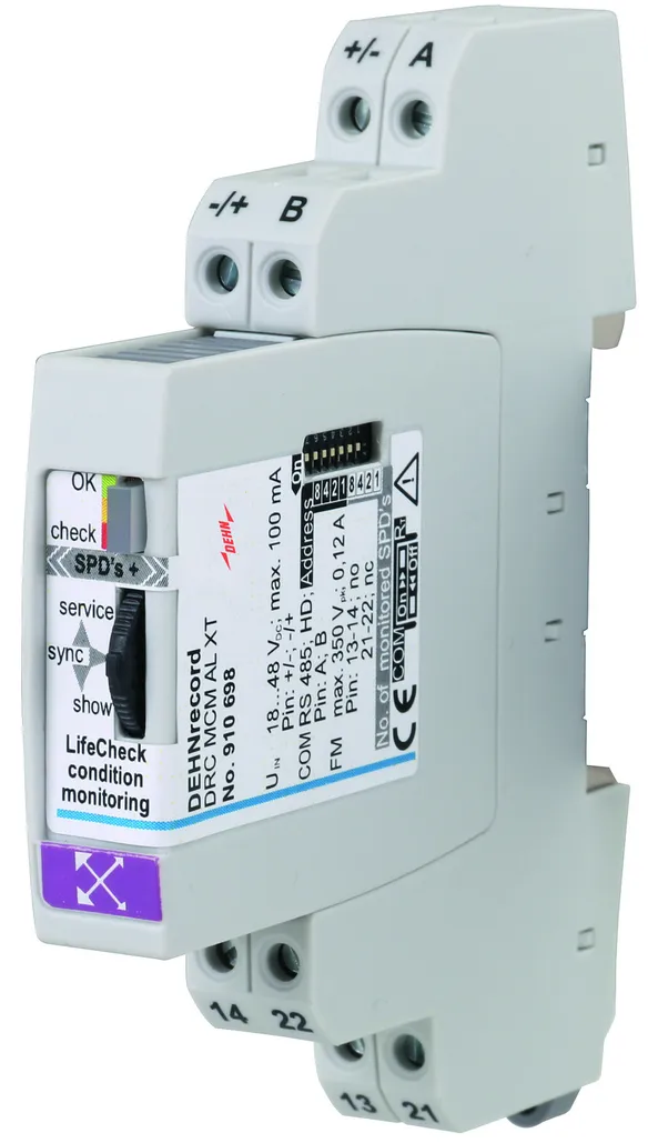 Dispositivo montado sobre carril DIN con sensor LifeCheck integrado para la vigilancia del estado operativo de máx. 10 BLITZDUCTOR XT / XTU con LifeCheck. Transmisión del estado operativo, la dirección bus y los números de artículo de los BXT a la unidad de comunicación DEHNrecord Alert.