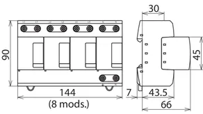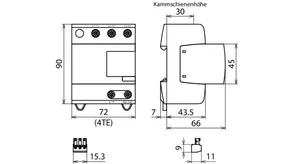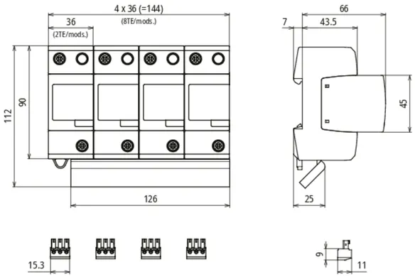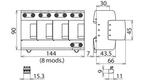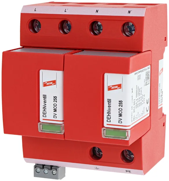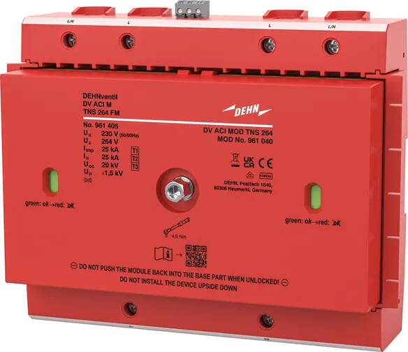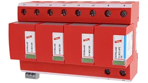 - Descargador combinado precableado Tipo 1 + Tipo 2 + Tipo 3 basado en vías de chispas, consistiendo en base y un módulo de protección enchufable individual
