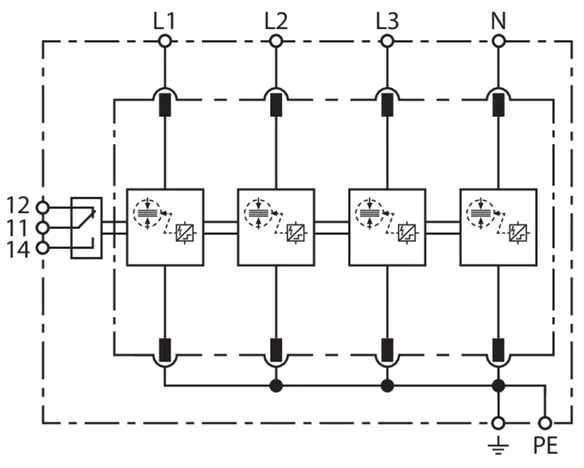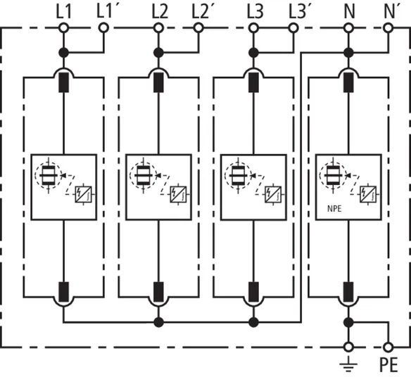 | Corriente de impulso de rayo total (10/350 µs) [L1+L2+L3+N-PE] (Itotal ) | 100 kA |