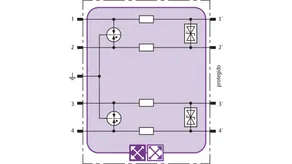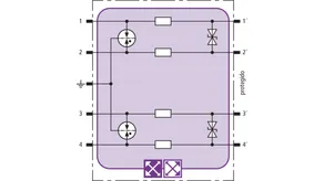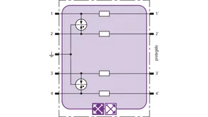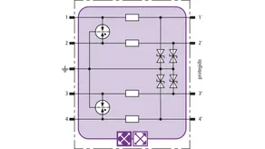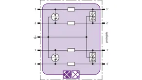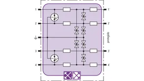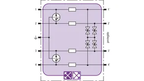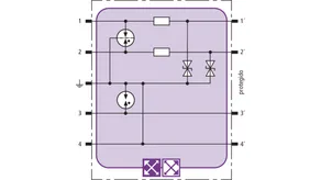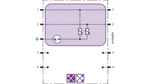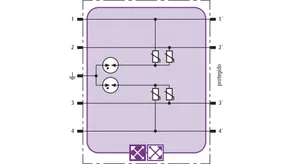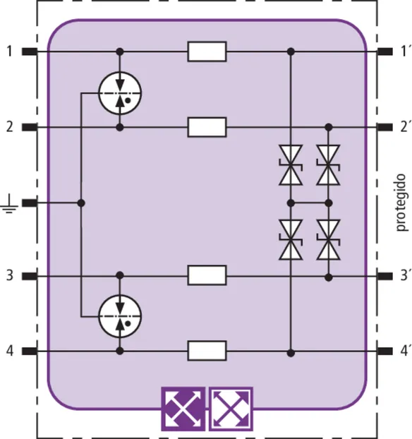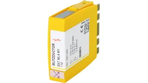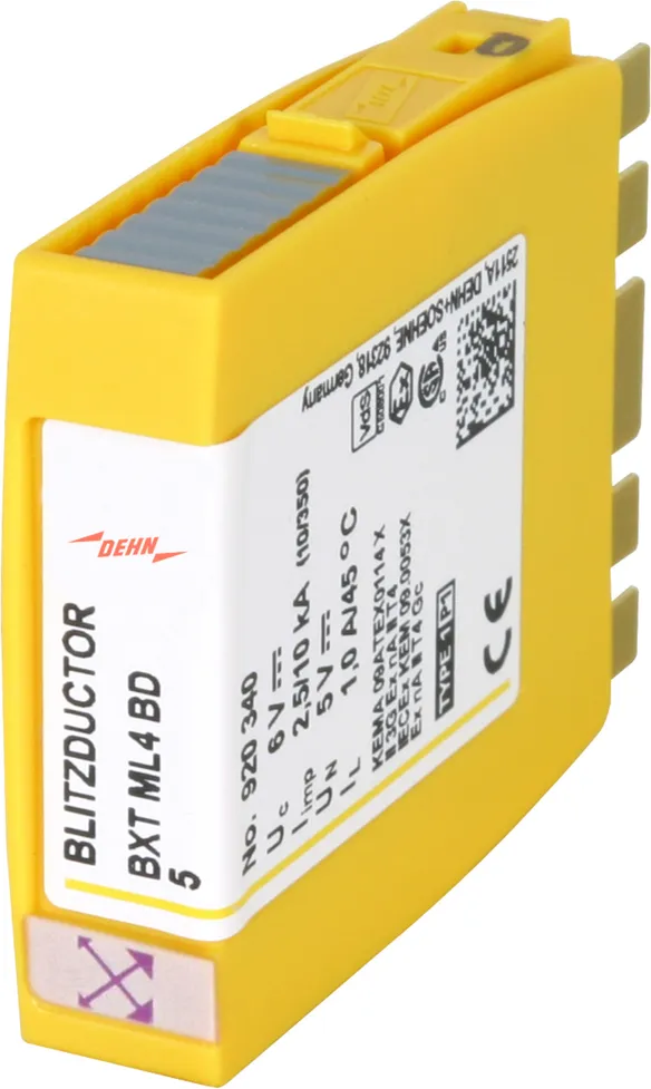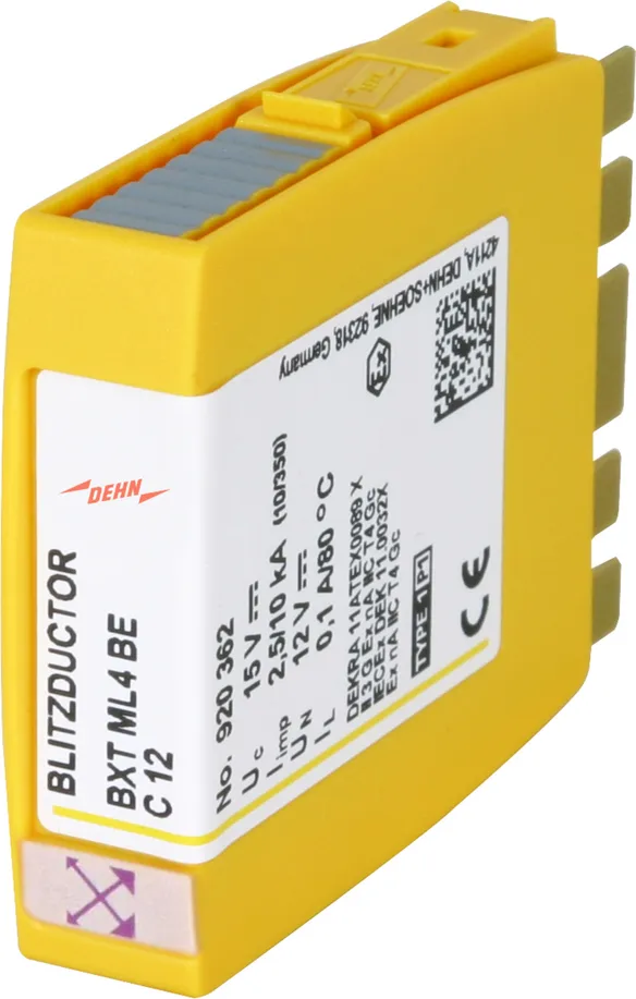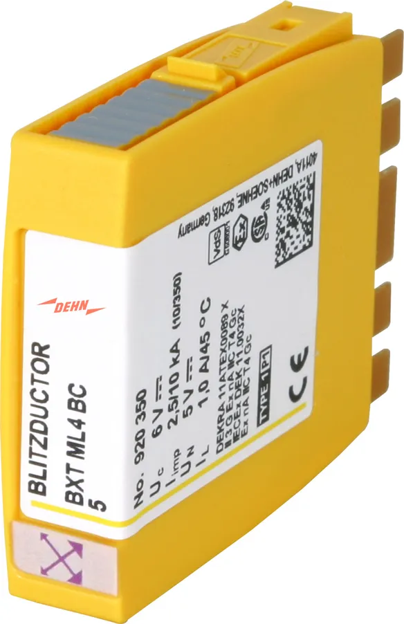 Módulo descargador combinado de corrientes de rayo y sobretensiones de gran ahorro de espacio, con función RFID LifeCheck, para protección de cuatro hilos individuales con potencial de referencia común así como interfaces asimétricas. Si la función LifeCheck detecta sobrecarga eléctrica o térmica el descargador ha de ser reemplazado. Este estado se indica sin contacto por el lector DEHNrecord LC / SCM / MCM.