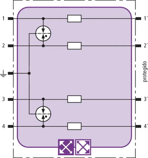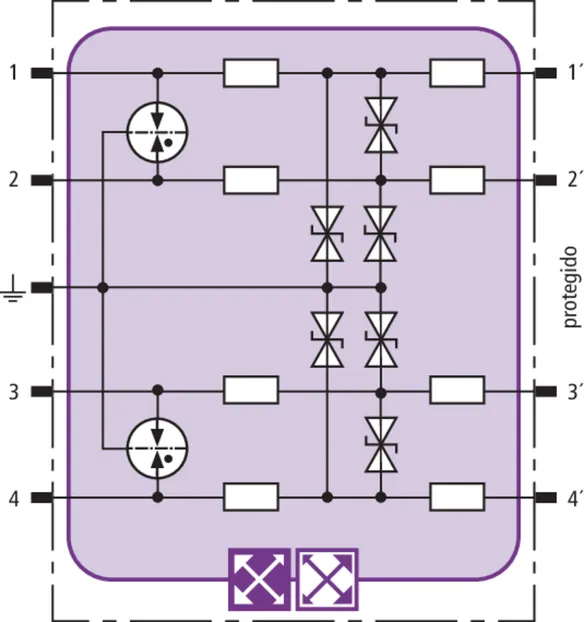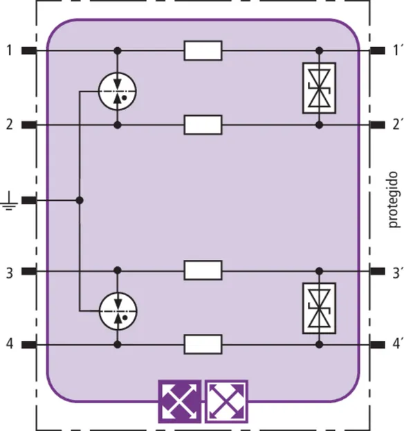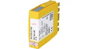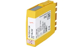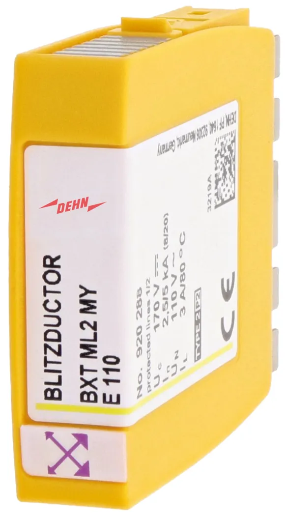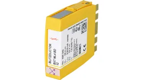 Módulo descargador combinado de corrientes de rayo y sobretensiones de gran ahorro de espacio, con función RFID LifeCheck, para protección de dos hilos individuales con potencial de referencia común así como interfaces asimétricas, con puesta a tierra del apantallamiento directa o indirectamente. Si la función LifeCheck detecta sobrecarga eléctrica o térmica el descargador ha de ser reemplazado. Este estado se indica sin contacto por el lector DEHNrecord LC / SCM / MCM.