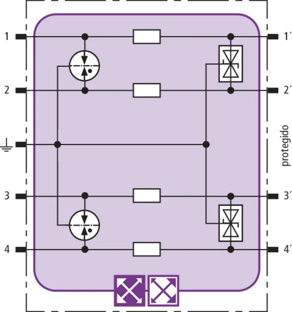 Módulo de protección de descargador combinado de espacio reducido con función RFID LifeCheck para la protección de 1 par de hilos de interfaces simétricas sin referencia a tierra, con opción de puesta a tierra directa o indirecta del apantallamiento. Si el sistema LifeCheck detecta sobrecarga térmica o eléctrica, el descargador de sobretensiones se debe reemplazar. Este estado se indica sin contacto mediante DEHNrecord LC / SCM / MCM.