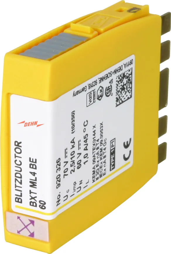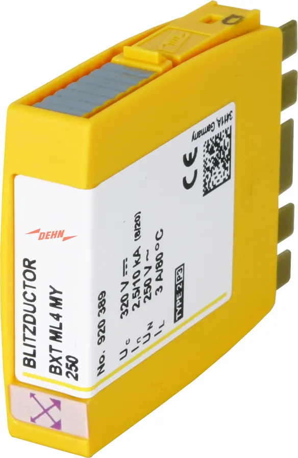 Módulo de descargador de corriente de para cuatro hilos, con función RFID-LifeCheck, para prácticamente todas las aplicaciones. Por lo general se utiliza junto con descargadores de sobretensiones subordinados Q con igual o inferior tensión de servicio. Si la función LifeCheck detecta sobrecarga eléctrica o témica el descargador ha de ser reemplazado. Este estado se indica por el lector DEHNrecord LC / SCM / MCM sin necesidad de contacto.