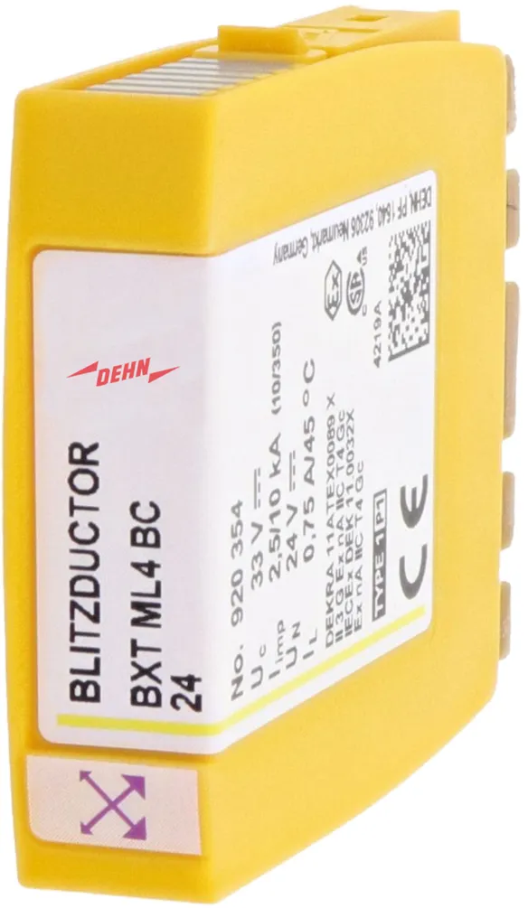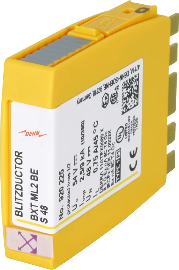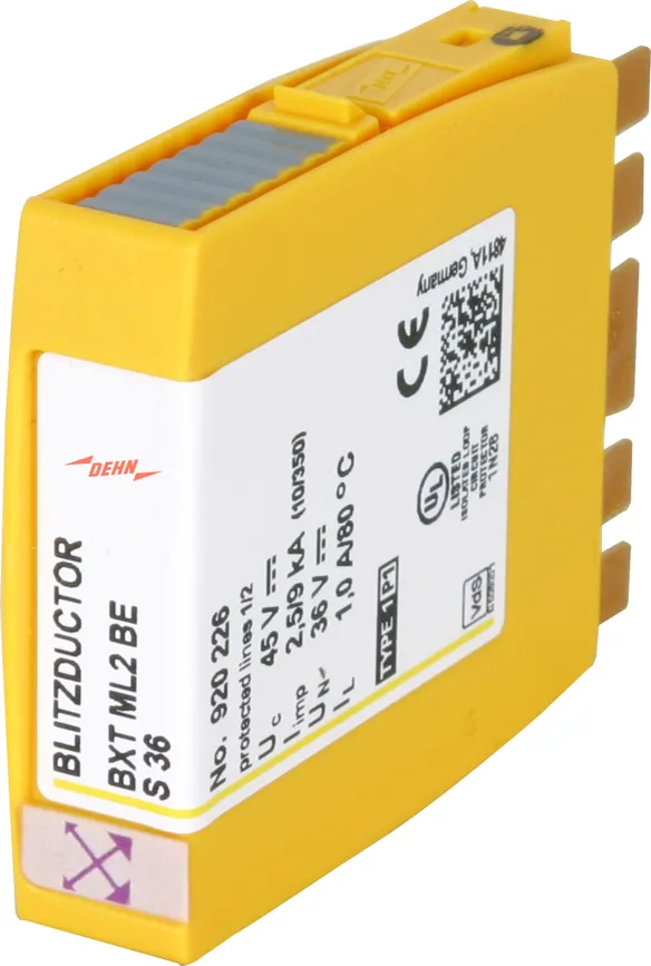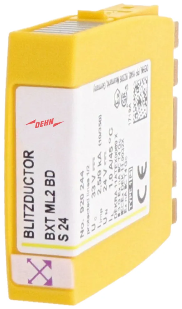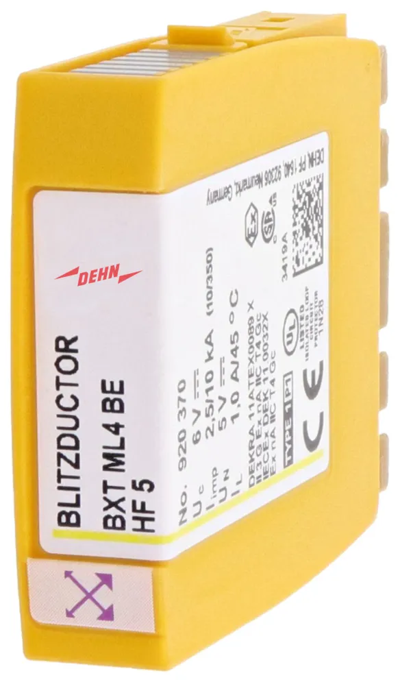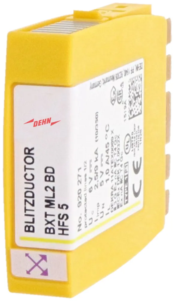 Módulo descargador combinado de corrientes de rayo y sobretensiones de gran ahorro de espacio, con función RFID LifeCheck, para protección de un par de hilos de transmisión de alta frecuencia sin aislamiento galvánico, con puesta a tierra del apantallamiento directa o indirectamente. Si la función LifeCheck detecta sobrecarga eléctrica o térmica el descargador ha de ser reemplazado. Este estado se indica sin contacto por el lector DEHNrecord LC / SCM / MCM.