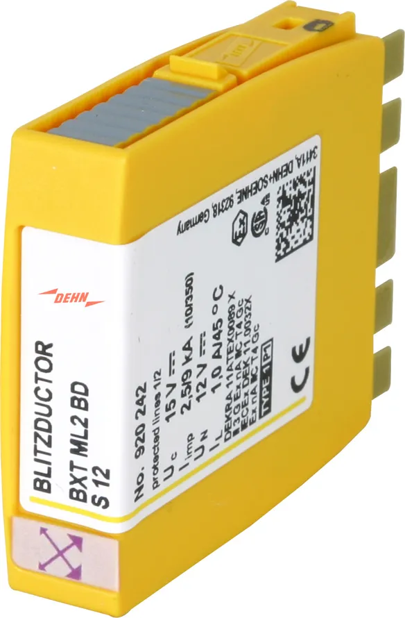 Módulo descargador de corrientes de rayo de gran ahorro de espacio, con función RFID LifeCheck, para protección de dos hilos y puesta a tierra del apantallamiento para todas las aplicaciones. Para utilizar en conjunto con descargadores de sobretensiones Q o descargadores combinados de corrientes de rayo y sobretensiones con un nivel de tensión igual o inferior. Si la función LifeCheck detecta sobrecarga eléctrica o térmica el descargador ha de ser reemplazado. Este estado se indica sin contacto por el lector DEHNrecord LC / SCM / MCM.