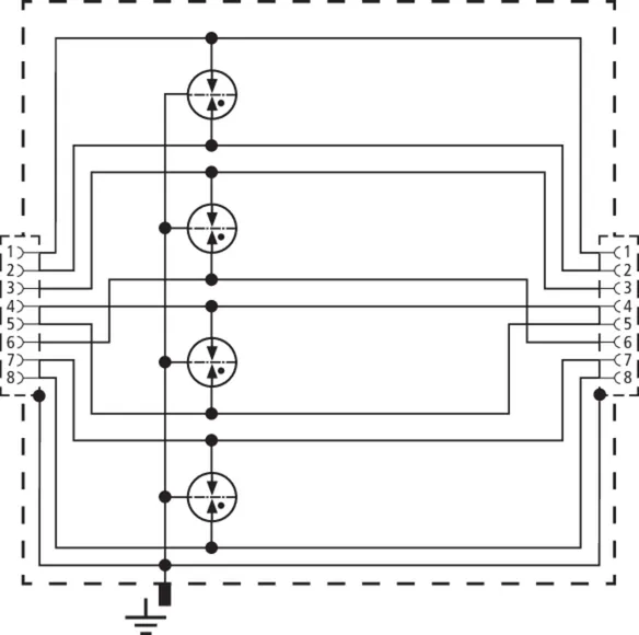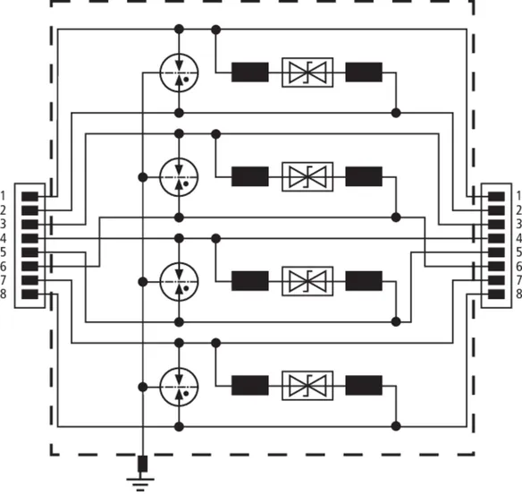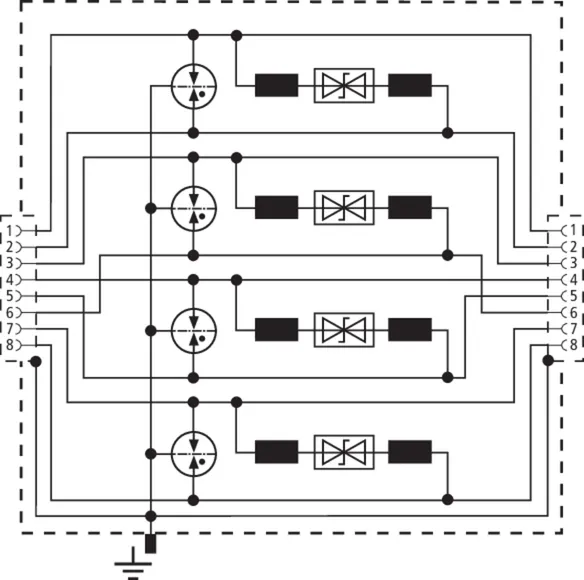 Descargador universal para Ethernet Industrial, alimentación por Ethernet (conforme a IEEE 802.3 hasta PoE++/4PPoE) y aplicaciones similares para sistemas de cable estructurado según clase E hasta 250 MHz. Protección de todos los pares a través de descargadores de gas y una matriz de filtros por par. Ejecución completamente blindada para montaje en carril DIN (hasta 1 Gbit Ethernet).