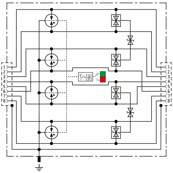 Descargador combinado universal de tamaño reducido en ancho de 19 mm y conexión RJ45 con indicación de estado para un mantenimiento sencillo. Protección de aplicaciones en cableados estructurados según la clase EA hasta 500 MHz, por ejemplo, Ethernet industrial, distribuidor de datos, sistemas de cámaras digitales, Power over Ethernet (conforme a IEEE 802.3 hasta 4PPoE) e interfaces basadas en Ethernet en general. Protección de todos los pares de hilos mediante descargador de gas de alto rendimiento y diodos de protección entre las líneas de señal, así como de pares de hilos. Tipo de adaptador totalmente apantallado con casquillo RJ45 para el montaje en carril DIN. Con conexión roscada adicional por el lado de la carcasa para una óptima conexión a tierra.