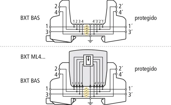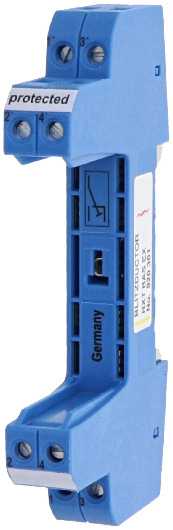 La base del BLITZDUCTOR XT es una borna de paso tetrapolar, universal para circuitos autoprotegidos, de gran economía de espacio, para inserción de los módulos de protección sin interrupción de la señal no estando enchufado el módulo. La toma de segura del módulo de protección se efectúa a través del carril DIN. Como en la etapa de base no se incluye ningún elemento constructivo del circuito de protección, los trabajos de mantenimiento quedan limitados a los que eventualmente se realicen en los módulos de protección.