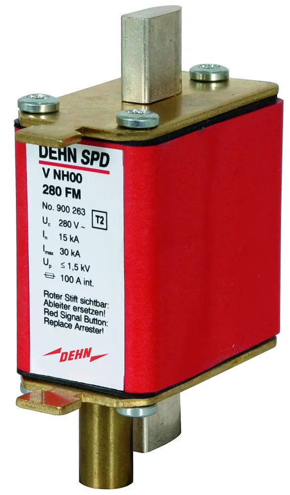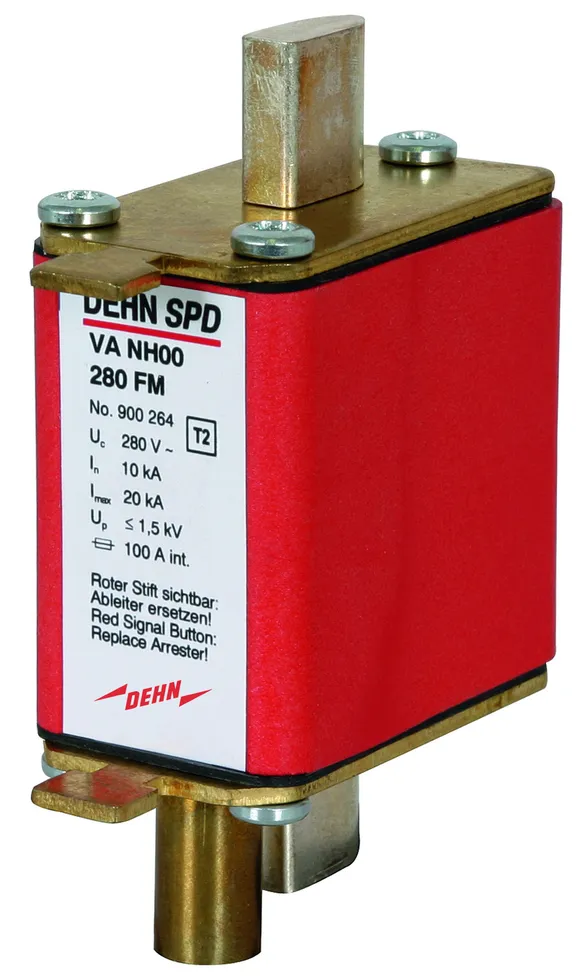 Descargador de protección contra sobretensiones basado en varistor y vía de chispas conectados en serie con fusible previo al descargador integrado; para utilizar en ejecución de fusibles NH tamaño 00, opcionalmente disponible con indicador especial para señalización remota.