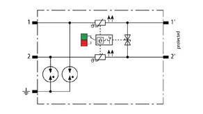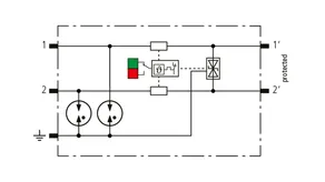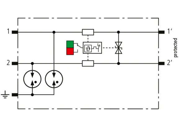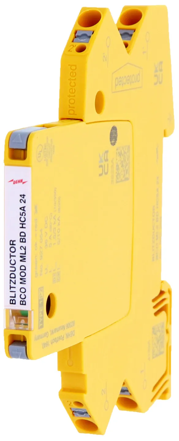 Descargador combinado de corrientes de rayo y sobretensiones modular, con ahorro de espacio, con 6 mm de ancho y técnica de conexión Push-in con indicación del estado operativo para la protección de un par de hilos en sistemas 24 V dc. Para su utilización también en caso del polo negativo puesto a tierra. Los resistores PTC integrados permiten una repuesta segura del descargador después de una interferencia en el circuito de la instalación con corrientes de cortocircuito hasta 40 A. Con interrupción de la señal para trabajos de mantenimiento.