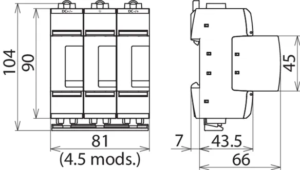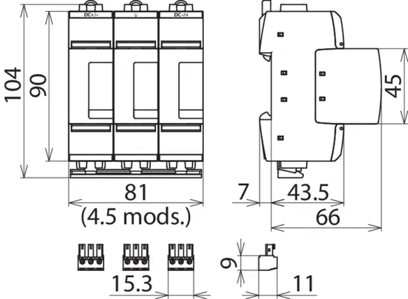 - Unidad modular completa y precableada para instalaciones fotovoltaicas, hasta 1500 V, compuesta por los elementos de base y los módulos de protección enchufable