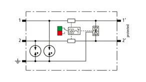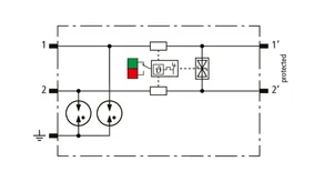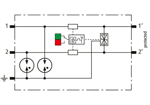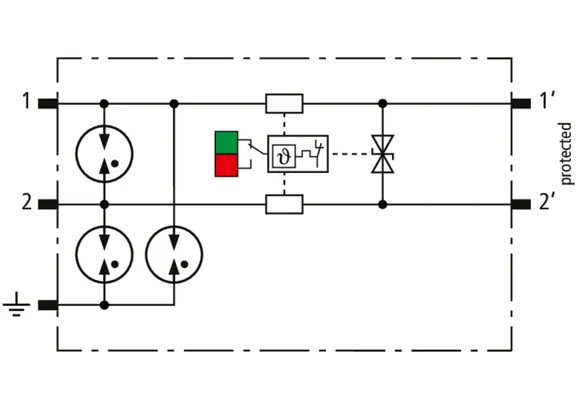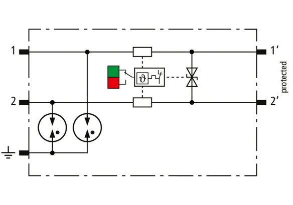 Descargador combinado de corriente de rayo y sobretensiones de espacio reducido de 12 mm de ancho y tecnología de conexión Push-in con indicación de estado para la protección de 1 par de hilos de sistemas de alimentación de CC sin referencia a tierra para redes de transmisión de datos y circuitos de medición y control.