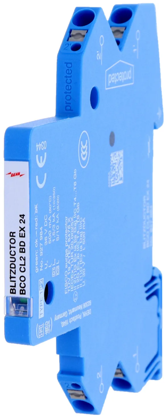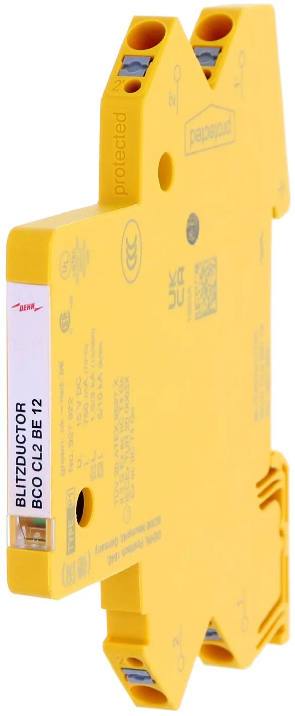 Descargador compacto combinado de corrientes de rayo y sobretensiones que ahorra espacio con un ancho de solo 6 mm y técnica de conexión Push-in con indicación del estado operativo para la protección de 1 par de hilos de circuitos de medida intrínsecamente seguros y sistemas bus. Cumple los requerimientos según FISCO. Resistencia de aislamiento > 500 V hilo-tierra.