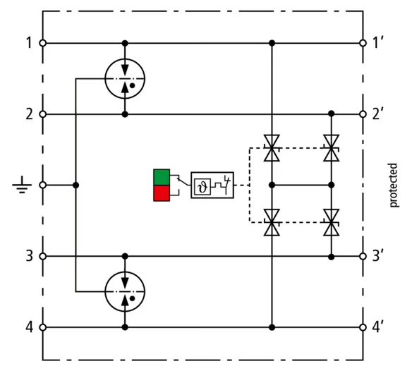 Descargador combinado de corriente de rayo y sobretensiones de espacio reducido de 12 mm de ancho y tecnología de conexión Push-in con indicación de estado para la protección circuitos de medida de 4 conductores sin referencia a tierra de redes de transmisión de datos y técnica de medida y control.