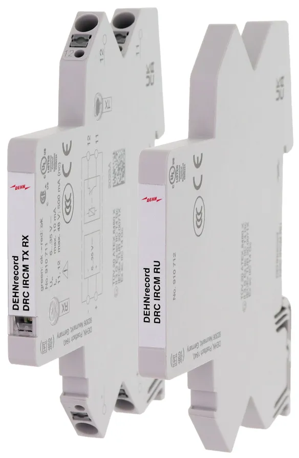 Unidad de monitorización de estado operativo DEHNrecord, kit de equipos para montaje en carril DIN con transmisor/receptor óptico integrado, así como una unidad de desviación para la monitorización de estado de descargadores BLITZDUCTORconnect y DEHNpatch con LifeCheck. Señalización óptica del estado operativo del descargador a través del indicador LED colectivo combinado con la señalización a distancia (contacto normalmente cerrado).