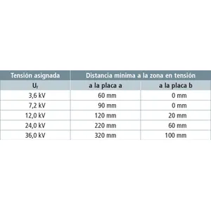 La marca limitadora es una línea continua y vale como limitación de la maneta del área de seguridad. Esa marca no debe sobrepasarse cuando se introduzca la placa. Estando introducida la placa protectora tiene que mantenerse una distancia mínima de 525 mm con las partes en tensión.