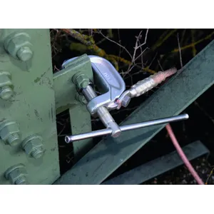 • Para conexión a tierra de puntos esféricos de anclaje, bulones de conexión en T, conductores planos y redondos y perfiles planos